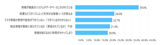 次に「商品情報管理」における悩みや課題に感じていることについて聞いたところ、「情報が複数のシステムやデータベースに分かれている」39.0%が最も多い結果となりました。