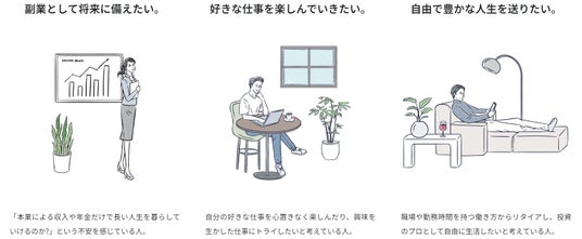 「将来に備えて、年金の足しになる収入の柱をつくっておきたい」「生活の基盤をつくり、本当にやりたいこと、好きなことに時間を使いたい」そんな誰もが持つニーズに対し、「投資のプロとして自由に暮らしていきたい」という想いを持ってる方もいます。