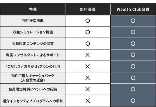 さらにプレミアム会員サービス「Wealth Club」へ加入すると、非公開物件情報を優先的に入手できるほか、専属コンサルタントによるサポートを受けられます。お客様一人ひとりのニーズに合わせたコンサルティングにより、FIREまでのロードマップが明確に描けるようになります。