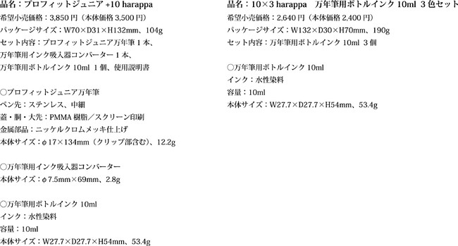 セーラー万年筆(社長:比佐泰、本社:東京都港区)は、「プロフィットジュニア+10(プラステン) harappa」、「10×3(テンバイスリー) harappa 万年筆用ボトルインク10ml 3色セット」を2022年3月5日(土)より全国のセーラー万年筆製品取扱販売店にて数量限定発売いたします。