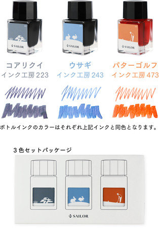 万年筆、インク吸入器コンバーター、ボトルインク10ml の3 点が入ったセットで、万年筆が初めての方でもこれ1つで気軽に楽しむことができます。使い方やお手入れ方法も、わかりやすいイラスト入り説明書付きで安心です。第2 弾の今回は、「原っぱにあらわれるいきもの」がモチーフのharappa がテーマ。万年筆本体とボトルインクのラベルには他にはない可愛らしい3 種のデザインが施されており、インク色に合わせたオリジナルコンバーターはこのセット限定カラーです。