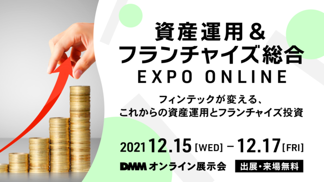 弊社は、2021年12月15日(水)~ 12月17日(金)の3日間にわたり合同会社DMM.com(本社:東京都港区、代表取締役:亀山 敬司)がオンライン主宰する「資産運用&フランチャイズ総合 EXPO ONLINE」へ出展いたします。