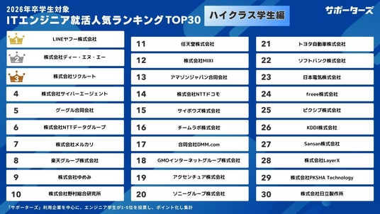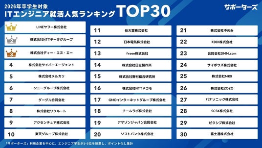 株式会社CARTA HOLDINGSのグループ会社で、国内最大級のエンジニア学生のデータベースを持つ株式会社サポーターズ(東京都港区、代表取締役:楓 博光)は、「2026年卒対象 ITエンジニア就活人気企業ランキング」調査結果(以下、本調査)を公開しました。