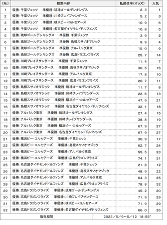 優勝・準優勝予想の1番人気は、優勝が東地区1位で歴代最高勝率を記録したレギュラーシーズン勝率88.3%の千葉ジェッツ、準優勝が西地区1位で同勝率80%の琉球ゴールデンキングスで、払戻倍率(オッズ)は2.3倍!2番人気は、優勝が琉球ゴールデンキングス、準優勝が千葉ジェッツで、払戻倍率(オッズ)は3.9倍、3番人気は、優勝が千葉ジェッツ、準優勝が中地区1位で同勝率66.7%の川崎ブレイブサンダースで、払戻倍率(オッズ)は5.2倍、となっています。