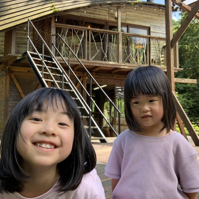 ウッドデザインパーク岡崎名物「ツリーハウス」の前でパシャリ