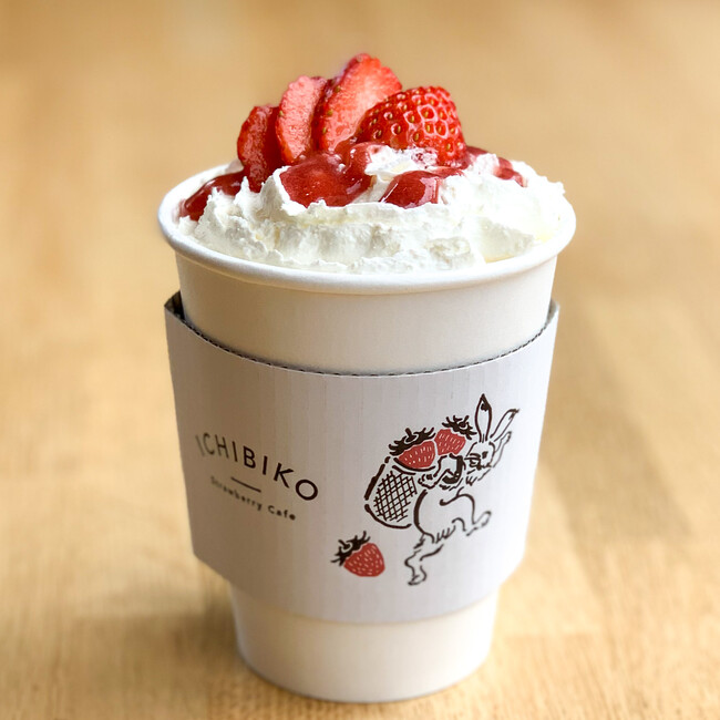 自家製いちごミルクのもとに温めたミルクを注いでホイップクリームと完熟もぎのいちごをトッピングした冬季限定のいちびこミルクです。