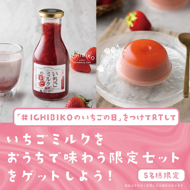 ICHIBIKO公式Twitter( @ichibiko_jp )の対象ツイートに「#ICHIBIKOいちごの日」をつけて引用リツイートしていただいた方から抽選で5名様にプレゼントいたします。