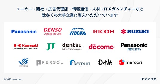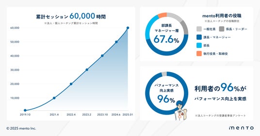 「mento(メント)」は、リーダーの本音を引き出して組織を変える、管理職向けコーチングサービスです。企業の皆様に高品質なコーチングをより手軽に使っていただけるプラットフォームをオンラインで展開しています。これまでに累計60,000時間以上のコーチングを提供しており、登録コーチは約200名にのぼります。2020年のリリース以降、パナソニック、伊藤忠、電通をはじめとする大手企業を中心に導入が広まっています。