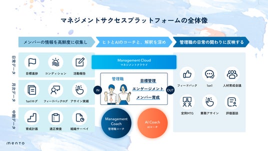 そんななか管理職コーチ「mento」は、現場で奮闘する中間管理職に寄り添い、社外のプロコーチによる1on1のコーチングを提供しています。一人ひとりの悩みや適応課題に対して個別最適なアプローチを提供することで、日本の中間管理職が「育て上手」になり、真のリーダーシップを発揮して組織の熱を高めることを支援してきました。