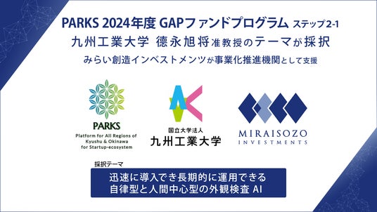 科学技術振興機構(JST)「大学発新産業創出基金スタートアップ・エコシステム共創プログラム」の採択プログラムであるPARKS(Platform for All Regions of Kyushu & Okinawa for Startupecosystem:オール九州スタートアップエコシステムプラットフォーム)による「2024年度 スタートアップ・エコシステム共創プログラム GAPファンドプログラム STEP2-1」に国立大学法人九州工業大学(福岡県北九州市、学長:三谷 康範、以下「九州工業大学」) 大学院情報工学研究院 知能情報工学研究系 徳永 旭将准教授のテーマ「迅速に導入でき長期的に運用できる自律型と人間中心型の外観検査AI」が採択されました。QBキャピタル合同会社(福岡県福岡市、代表社員:坂本 剛)と株式会社みらい創造インベストメンツ(東京都港区、代表取締役社長:岡田 祐之)は本テーマについて事業化推進を支援し、技術の事業化、スタートアップ創業を目指します。