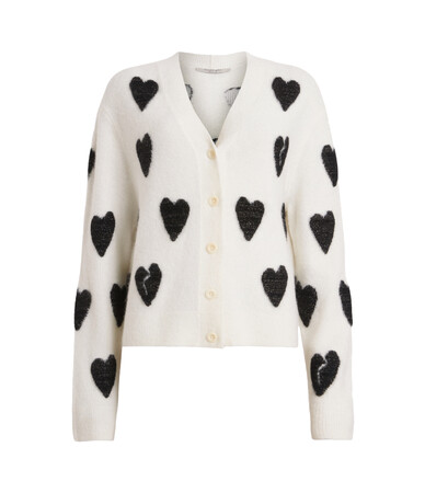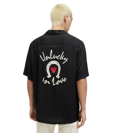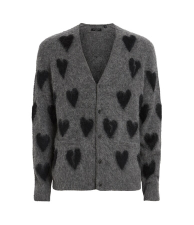 メンズコレクションは、モノトーンに映えるレッドをポイントカラーで取り入れ、オールセインツらしいスタイリッシュなデザインに落とし込みました。AMORAカーディガンは、ブラックとグレーの落ち着いた配色で、ハート柄をクールな印象で着こなせる1着です。AMORAクルーネックセーターは、1つだけある赤い割れたハートが遊び心のあるアクセントになっています。CHANCEUXシャツは、コレクションのテーマである「UNLUCKY IN LOVE」というメッセージが描かれた、ポップなバックスタイルが魅力です。