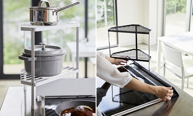 高さがあるから排気口カバーの上から設置できるコンロラック。
