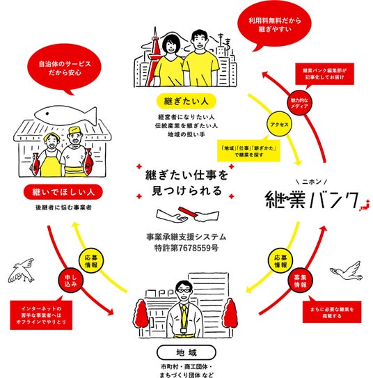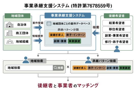 地域ごとに、後継者不在の事業者のニーズに応じた多様な承継パターンを通じて、最適な後継者とのマッチングを実現する「事業承継支援システム」が、特許第7678559号として登録されました。