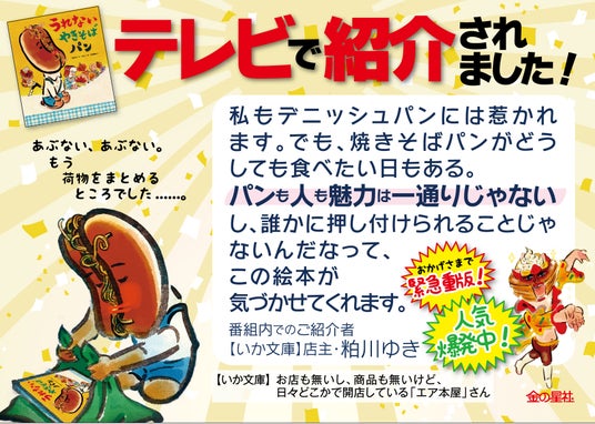 絵本『うれないやきそばパン』は、売れ残った焼きそばパンのピョンタが、潰れそうなパン屋さんで奇跡を起こす心温まる物語です。絵は、NHK朝の連続テレビ小説『おちょやん』タイトルバックのアニメーションなども手掛けた、いぬんこさん。レトロでノスタルジックなこの絵本は、朝の情報番組にて紹介されたことをきっかけに、全国の書店およびオンラインストアで注文が殺到。品切れが続き、ご迷惑をおかけしていましたが、緊急重版し、いよいよ本日出来! 2012年の発売以来、大変多くの方々から「感動した」「子どもと一緒に楽しめた」「心が温かくなった」といった反響が寄せられているロングセラー絵本です。番組内でご紹介くださった、いか文庫店主・粕川ゆきさんからもコメントをいただきました。