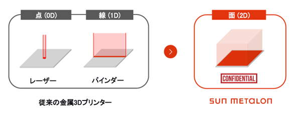 既存の金属3Dプリンターは、専用ソフトで作った断面スライスデータに基づき、点や線で1層ごとに金属材料を結合させて積層をくり返すことで、任意形状の造形体を作製するのが代表的ですが、SUN METALONはこれまでになかった造形方式により「面」で積層造形する金属3Dプリンティング技術を独自に着想しました。また、従来は均質に加工された金属粉末が必要だったのが、同社技術は不均質な金属粉末でも造形できることが大きな特徴です。結果、従来の金属3Dプリント技術と比べ、超高速500倍の生産性で90%以上のコスト削減を可能にしました。従来技術の課題であったスピード、経済性、スケーラビリティに抜本的な改善をもたらします。