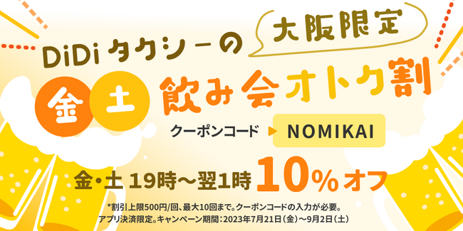 DiDiモビリティジャパン株式会社(本社:東京都港区、代表取締役社長:和久山 大輔)は、2023年7月21日(金)より、大阪エリアで「DiDiタクシーの金・土飲み会おトク割」キャンペーンを開催します。