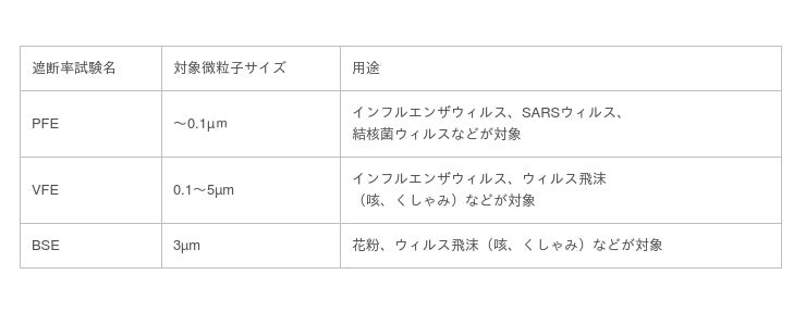 空気中の微粒子・細菌・ウイルスがマスクに使われているフィルター部分を通して、どれだけ「ろ過(捕集)」されたかの測定値を示す「遮断率試験」があり、遮断率試験には以下のような種類があります。