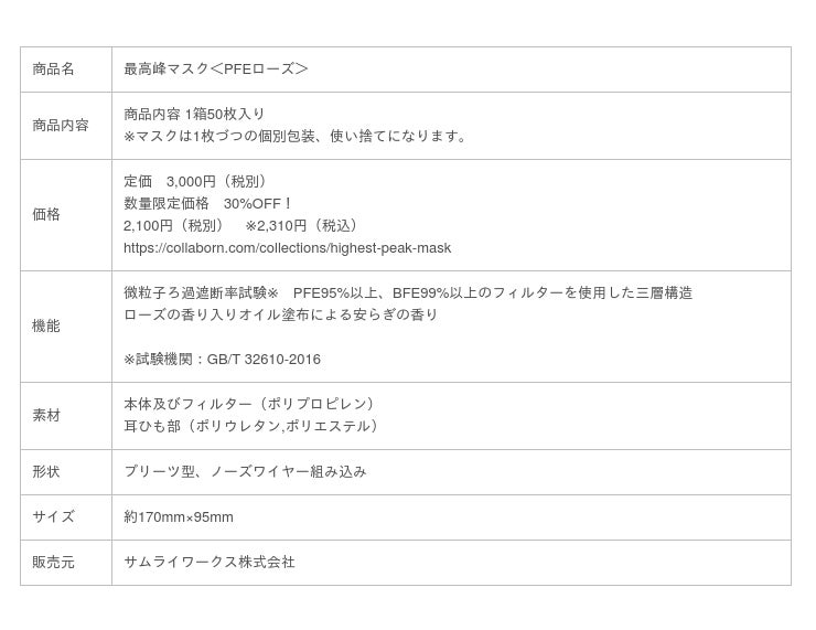 原価マスクや日本の技術の粋を集めた究極マスクを展開するサムライワークス株式会社(代表取締役社長:新島 実 本社所在地:東京都渋谷区)は、まだまだ続く猛暑で快適に感染予防を行ってもらう為に、1か月で累計300万枚販売の3層構造不織布マスクに高密度(PFE95%以上)のフィルターを採用し、更に甘く華やぐローズの香りで超リラックス!
