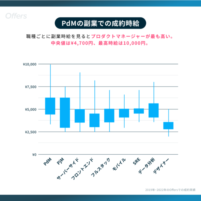 実際にOffersで契約に至った時給の分布では、プロダクトマネージャーは他職種に比べて高くなっています。プロダクトマネジメントという専門性の高い業務に対して、より高い報酬が支払われています。