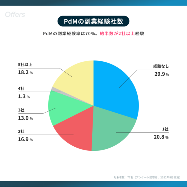 キャリアを作る方法として副業を経験される方が増えています。Offersが取ったアンケートでは、プロダクトマネージャーの副業経験率は70%でした。さらに約半数が2社以上経験しています。