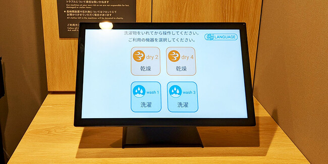 タッチパネル式タブレットでは多言語表記が可能です。ワンタッチで日本語、英語、韓国語、中国語(簡体字・繁体字)に表示を切り替えるため、海外からのお客様にも簡単にお使いいただけます。また、ランドリールームの案内を多言語で情報提供することにより、ホテルスタッフの負担軽減につながります。