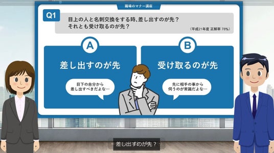女性社員は「A」を選び、動画内の「A」をクリックします(実際に動画をクリック可能)。講師が「正解です」とコメントし、答えを解説します。