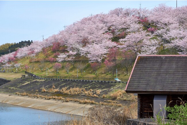 長柄町にある1985年に完成したアース式ダム「長柄ダム」の周辺には、カンヒザクラやヨウコウザクラ、ソメイヨシノ、ヤエザクラなど約3,200本の桜の木が植えられており、ソメイヨシノが満開になるとダム湖が淡いピンク色に包まれ絶景が広がります。