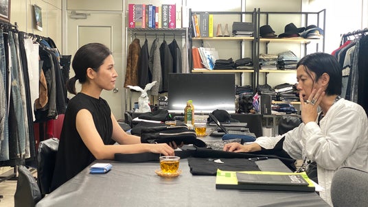 [コラボレーション開発会議での打ち合わせ風景 写真左 / 倉敷帆布 武鑓綾香 様 写真右 / 青木被服 デザイナー 青木 俊樹]