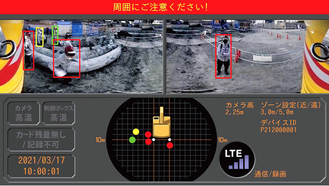重機に近づくと人物の位置をモニター表示し、アラート音や回転灯で通知します。
