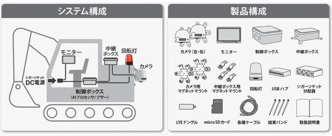 「ドボレコ(R)JK」 は、独自のAI画像解析技術で高精度に人物を検知し、人物の接近を映像とアラート音・警告灯で注意喚起するカメラシステムです。作業者に検知用タグを携帯させる必要がなく、重機に近づく人を検知しモニターに表示、アラート音や回転灯で危険を知らせます。検知範囲は1台200度(2台の場合、270度)の視野角で、検知距離は8mです。「ドボレコ(R)JK」専用のカメラマウントは、マグネットや粘着テープで簡単に取り付けができ、また、カメラの自動姿勢補正により、重機の様々な場所に設置が可能です。