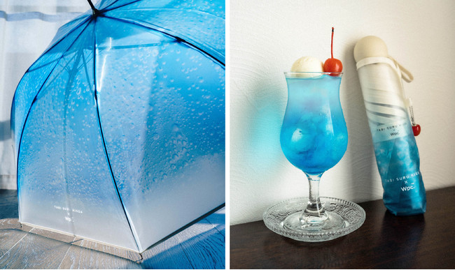 日本全国を巡り、旅をしながらオリジナルのクリームソーダをつくる「旅する喫茶」。思わず見惚れてしまうような透明感のある写真を傘のデザインに落とし込み、その世界観を表現した旅する喫茶とのコラボレーションです。