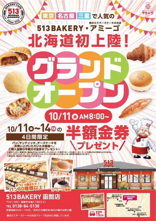 北海道生まれの宅配ピザチェーン10.4(テンフォー)を運営する、株式会社テンフォー(本社・北海道函館市/代表・高橋仁志)は、2024年10月11日(金)に北海道函館市に東京・愛知・三重で人気の513BAKERYの北海道初の店舗となる『513BAKERY 函館店』をオープンいたします。また、店内には『焼きたてチーズケーキのお店アミーゴ』を併設。パンもチーズケーキも楽しめる店舗となっております。