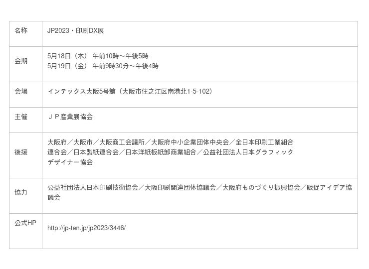 イベントの総合プロデュース事業を展開する株式会社トーガシ(本社:東京都江戸川区、代表取締役 吉田守克)は、5月18日(木)・19日(金)にインテックス大阪にて開催される、西日本最大の印刷関連機材総合展示会「JP2023・印刷DX展」の会場施工をサポートいたします。