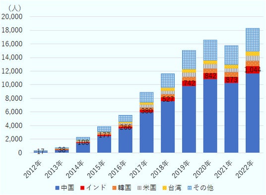 図:国籍別高度外国人材の在留者推移 (出展:https://www.jetro.go.jp/biz/areareports/special/2024/0304/94b7577df1b2fa87.html)