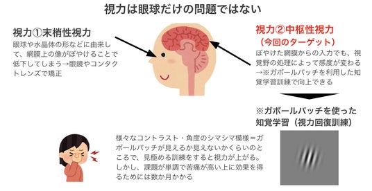近視や加齢に伴う視力(VA: Visual Acuity)の低下は多くの人々にとって日常生活に支障をもたらす問題ですが、その回復は難しく、メガネなどの補綴器具を用いるか、外科手術などの侵襲的なアプローチによる対策しかありません。近年新しい視力回復技術として、知覚訓練による脳の視覚系の可塑性に基づいた学習(知覚学習)が注目され、中枢性の視力の視覚機能を改善可能であることが報告されています。