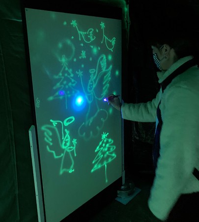 当日、特に人気があったのは「光のらくがきコーナー」。暗幕の中、5分ほどで消える光のペンで自由に落書きしてもらう新感覚の体験イベントですが、密にならないよう人数制限をかけた入れ替え制にして、1グループごとに消毒・換気を徹底しました。また、参加者には検温に加え、大阪コロナ追跡システムや問診票への記入をお願いしました。暗闇に浮かぶ文字や絵が書いては消える不思議な体験に子供、大人問わず全世代に大人気でした。