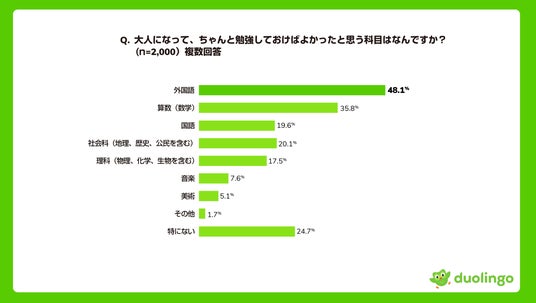 - 外国語(48.1%)、算数(数学)(35.8%)が、大人になって、ちゃんと勉強しておけばよかったと思う科目の上位に。