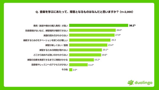 音楽学習には、語学学習と同様に「学習にかかる費用の高さ」や「継続の難しさ」といった課題が存在します。実際Duolingoが行った調査では、「音楽を学ぶにあたって、障害となるものはなんだと思いますか?」と言う質問に対し、「費用(楽器や教材の購入費用)が高い」と回答した人が最も多い結果となり、さらにこれまで音楽を学んだことがある人のうち7割以上が途中で挫折を経験したことが明らかになりました。(*2)