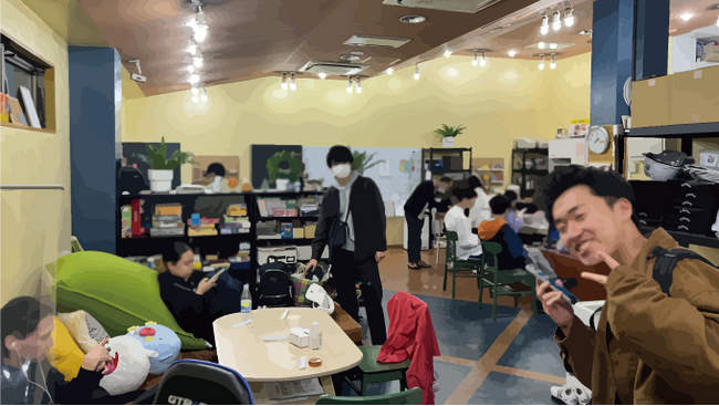 毎週土曜日18-21時にオープンする若者のためのフリースペースを運営しています。近隣の10代の若者、(元)ひきこもり、夜勤前の会社員--。さまざまな境遇の若者が訪れ、多いときは40名以上集まっています。