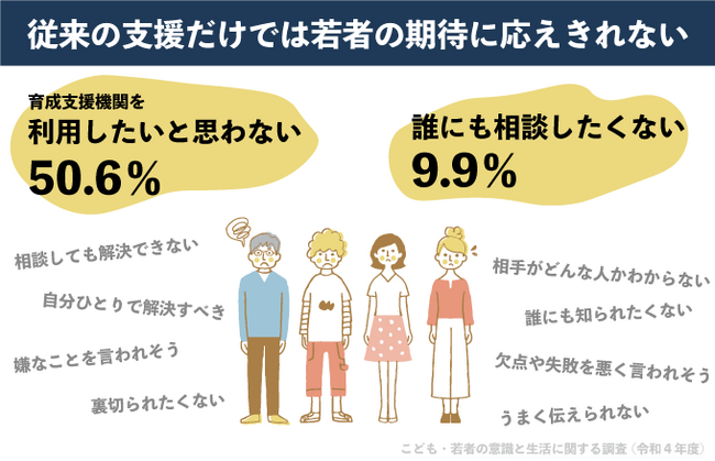 内閣府の調査では、10代から30代の若者の約5~7%が孤独感を「しばしば・常に感じている」という結果が出ています。若者の生きづらさにつながる「不登校」「児童虐待」は過去最多を記録し、中学2年生のヤングケアラーは5.7%、高校2年生で4.1%と1クラスにひとりは苦しい境遇にある若者がいることがわかります。