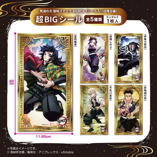 おまけの“超BIGシール”は全5種ランダム1枚入おまけは、オリジナルデザインの “超BIGシール”・全5種:冨岡義勇・胡蝶しのぶ・伊黒小芭内・不死川実弥・悲鳴嶼行冥