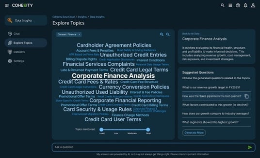 膨大なデータセットを扱う際にユーザーが直面する最大の課題の一つは、データにアクセスできるにもかかわらず、どこから手をつければよいのか、どのような価値あるインサイトを引き出せるのかが分からないことです。Cohesity Gaiaは、データを自動的にテーマごとに視覚的に整理することで、ユーザーに明確な出発点を提供し、この課題を解決に導きます。この新しいビジュアルエクスプローラーは、自然言語処理と高度なAIテクノロジーであるトピックモデリングを使用し、文書やファイル全体の隠れたテーマ構造を瞬時に特定します。データの性質に関する深いインサイトと文脈は、より良い理解のためのフレームワークを提供し、ユーザーが検索する際に、より情報に基づいた的を射た質問をすることに寄与します。