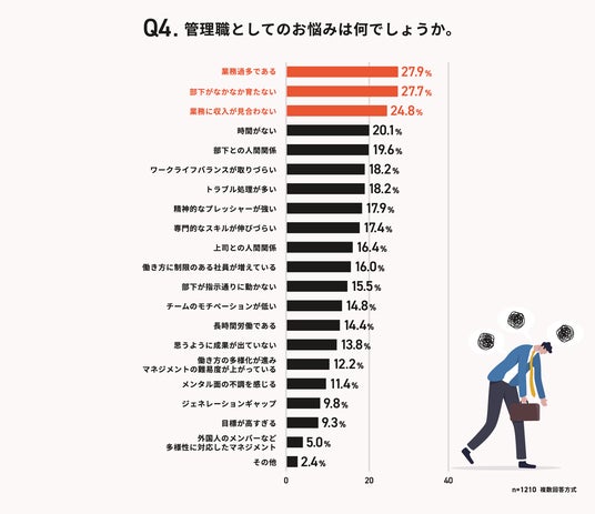 ・管理職の悩みとして「部下が育たない」「部下との人間関係」が上位に。部下との関係がマネジ