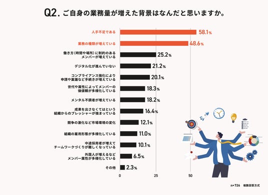 「ご自身の業務量が増えた背景は何だと思われますか」という問いに対し、 業務量が増加した背景に「人手不足」「業務の種類が増えている」「働き方に制約のあるメンバーの増加」といった回答が上位を占め、 構造的かつ人事的な課題が浮き彫りになりました。