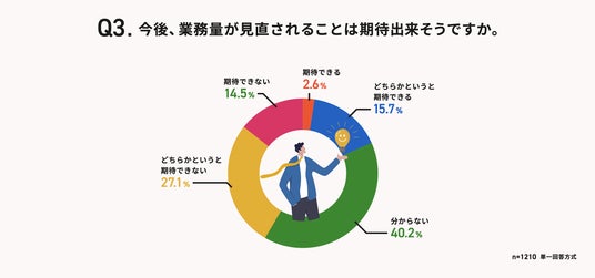 「今後、業務量が見直されると思うか」という問いに対しては、約8割が「期待できない」「わからない」と回答。 “頑張っても報われない”という空気感が、現場に広がっていることがわかります。