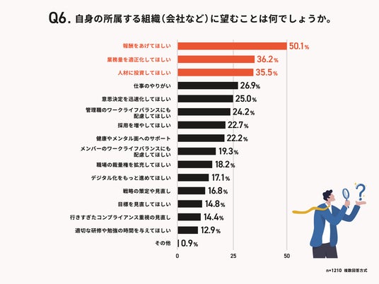 「自身の所属する組織(会社など)に望むことは何でしょうか」という問いに対して「報酬アップ」に加え、「業務量の適正化」「人材への投資」が上位にランクイン。 現場は“頑張る個人”ではなく、“育成と信頼が仕組みで回る組織”への転換を求めています。