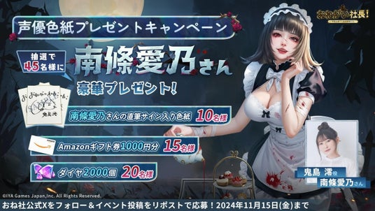 抽選賞品:南條愛乃さんの直筆サイン入り色紙*10名様、Amazonギフト券1000円分*15名様、ゲーム内アイテムダイヤ2000個*20名様