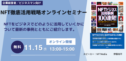 株式会社トレジャーコンテンツ(本社:東京都文京区、代表取締役:小林 憲人)は、運営するNFT専門メディア「NFT Media」にて、満足度94.8%の「NFT徹底活用戦略オンラインセミナー」を11月15日水曜日に開催することをお知らせします。