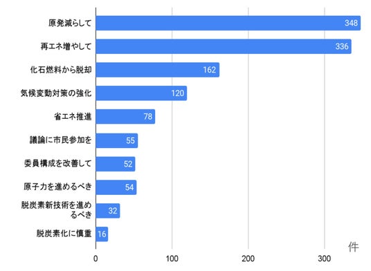 再エネ100%と公正な社会をめざすプロジェクト「ワタシのミライ」は、第7次エネルギー基本計画の改定議論を行う経産省が設置した「エネルギー政策に関する意見箱」に寄せられた意見内容の分析を行いました。その結果、以下のように「原子力の削減」「再エネの拡大」を求める声が圧倒的多数を占めていることがわかりました。これまでの審議会の議論では「原発活用、新増設にも前向き」「化石燃料温存」の意見が多数となっており、市民が求める内容と大きく乖離しています。