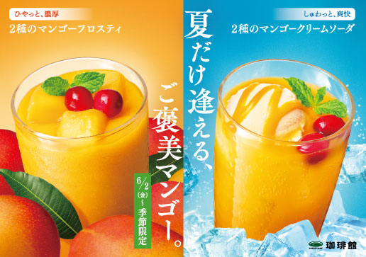 『珈琲館』と『珈琲館 蔵』より、ひやっと、濃厚 「2種のマンゴーフロスティ」と、 しゅわっと、爽快「2種のマンゴークリームソーダ」 が期間限定で登場します。